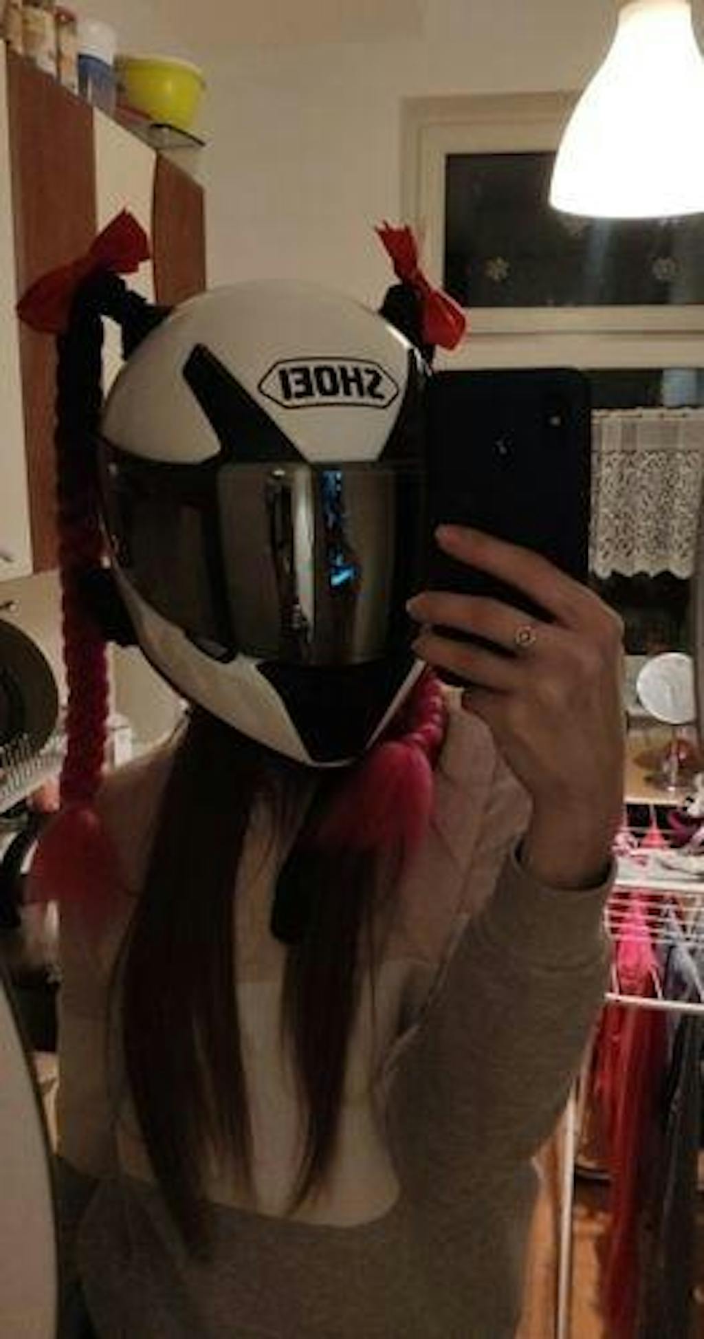 For you ladies a truly unique and great fun item, the ponytail or braid simply attaches to the helmet with a suction cup and can fit almost any type of helmet.